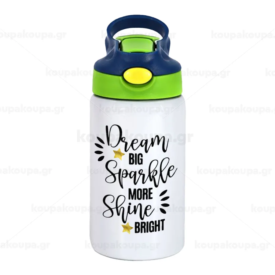Dream big, Sparkle more, Shine bright, Παιδικό παγούρι θερμό, ανοξείδωτο, με καλαμάκι ασφαλείας, πράσινο/μπλε (350ml)