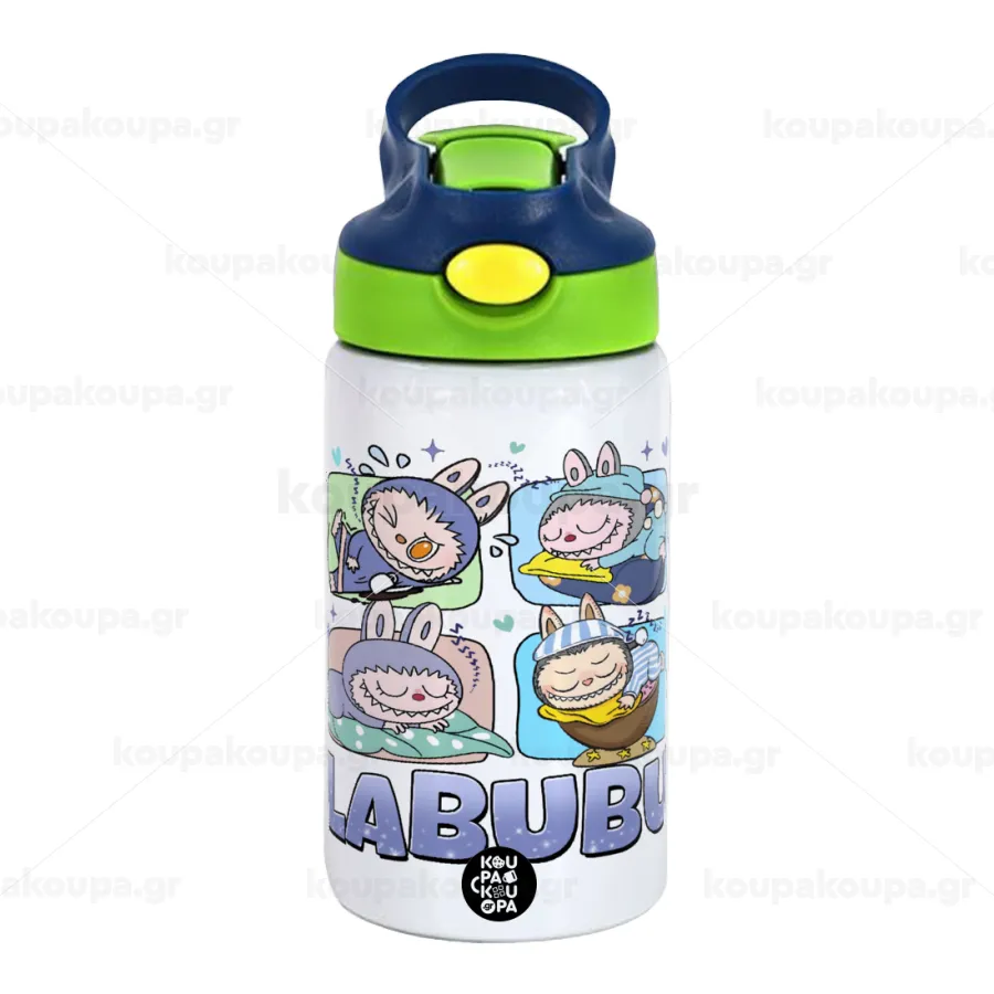 Labubu, Παιδικό παγούρι θερμό, ανοξείδωτο, με καλαμάκι ασφαλείας, πράσινο/μπλε (350ml)