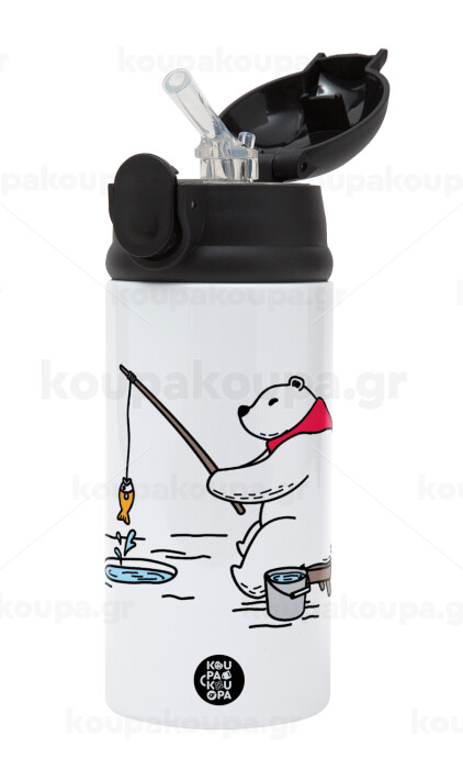 Αρκούδα ψαρεύει, Παιδικό παγούρι θερμό, ανοξείδωτο, με καλαμάκι ασφαλείας, Μαύρο (360ml) BPA-FREE