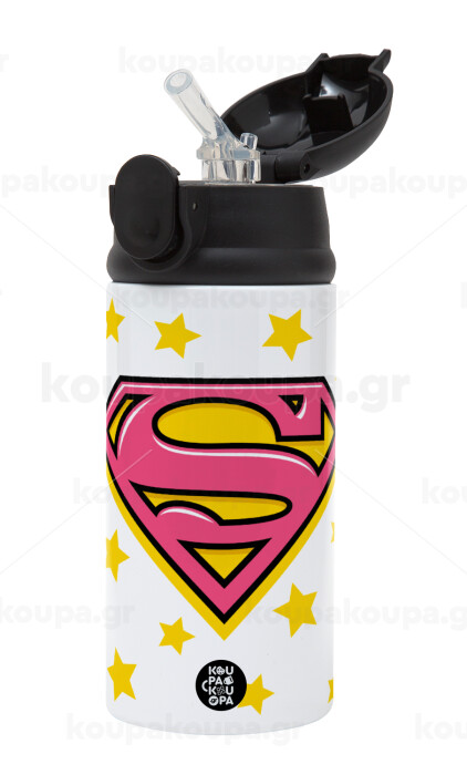 Superman Pink, Παιδικό παγούρι θερμό, ανοξείδωτο, με καλαμάκι ασφαλείας, Μαύρο (360ml) BPA-FREE