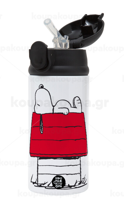 Το σπίτι του snoopy, Παιδικό παγούρι θερμό, ανοξείδωτο, με καλαμάκι ασφαλείας, Μαύρο (360ml) BPA-FREE