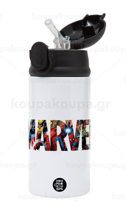 MARVEL characters, Παιδικό παγούρι θερμό, ανοξείδωτο, με καλαμάκι ασφαλείας, Μαύρο (360ml) BPA-FREE