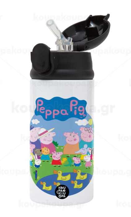 Peppa pig Family, Παιδικό παγούρι θερμό, ανοξείδωτο, με καλαμάκι ασφαλείας, Μαύρο (360ml) BPA-FREE