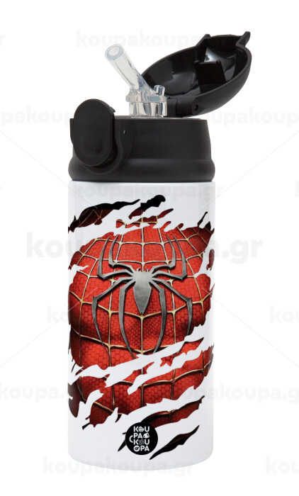 Spiderman cracked, Παιδικό παγούρι θερμό, ανοξείδωτο, με καλαμάκι ασφαλείας, Μαύρο (360ml) BPA-FREE