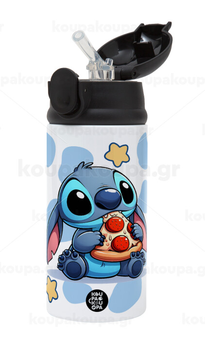 Stitch Pizza, Παιδικό παγούρι θερμό, ανοξείδωτο, με καλαμάκι ασφαλείας, Μαύρο (360ml) BPA-FREE