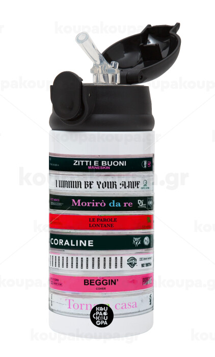 Maneskin Cassette, Παιδικό παγούρι θερμό, ανοξείδωτο, με καλαμάκι ασφαλείας, Μαύρο (360ml) BPA-FREE
