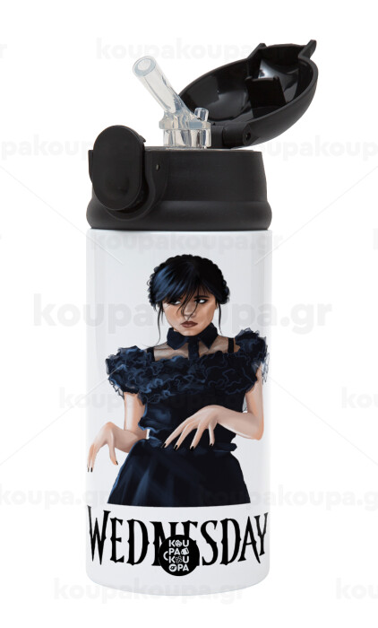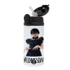 Wednesday Adams, dance with hands, Παιδικό παγούρι θερμό, ανοξείδωτο, με καλαμάκι ασφαλείας, Μαύρο (360ml) BPA-FREE