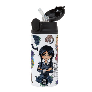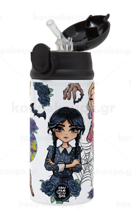 Wednesday and Enid Sinclair, Παιδικό παγούρι θερμό, ανοξείδωτο, με καλαμάκι ασφαλείας, Μαύρο (360ml) BPA-FREE