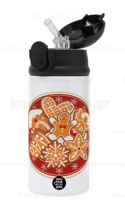 xmas cookies, Παιδικό παγούρι θερμό, ανοξείδωτο, με καλαμάκι ασφαλείας, Μαύρο (360ml) BPA-FREE