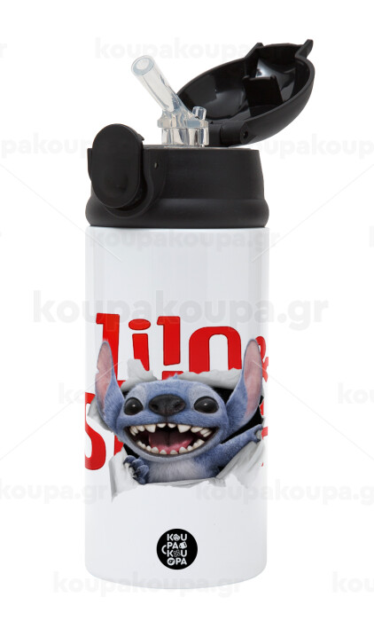 Stitch movie, Παιδικό παγούρι θερμό, ανοξείδωτο, με καλαμάκι ασφαλείας, Μαύρο (360ml) BPA-FREE