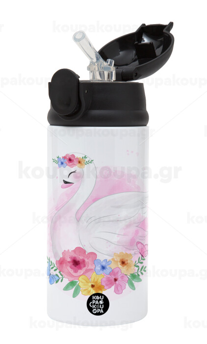 Λευκός κύκνος, Παιδικό παγούρι θερμό, ανοξείδωτο, με καλαμάκι ασφαλείας, Μαύρο (360ml) BPA-FREE