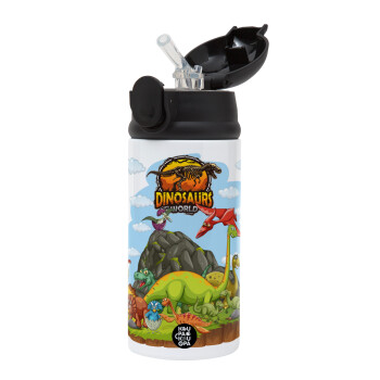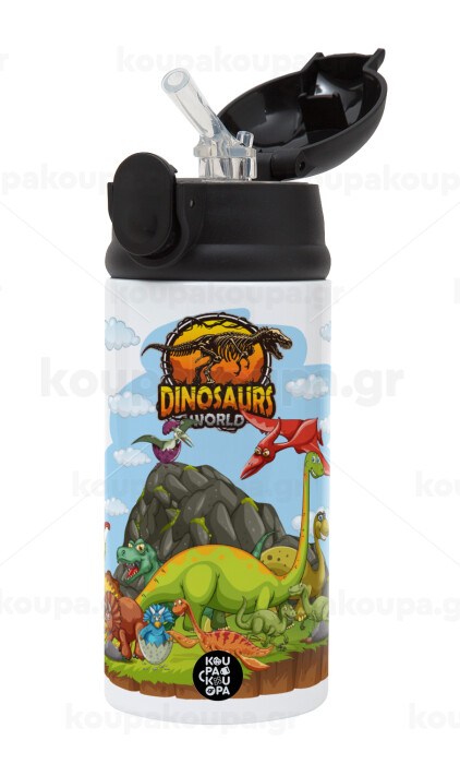 Dinosaur's world, Παιδικό παγούρι θερμό, ανοξείδωτο, με καλαμάκι ασφαλείας, Μαύρο (360ml) BPA-FREE