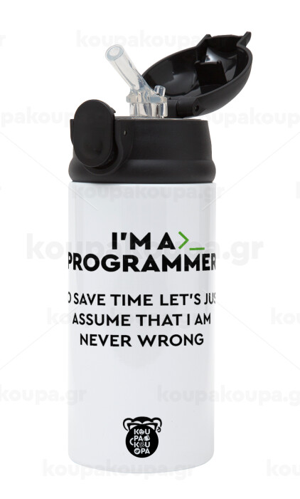 I’m a programmer Save time, Παιδικό παγούρι θερμό, ανοξείδωτο, με καλαμάκι ασφαλείας, Μαύρο (360ml) BPA-FREE