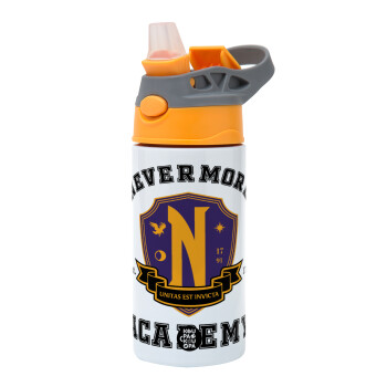 Wednesday Nevermore Academy University, Παιδικό παγούρι θερμό, ανοξείδωτο, με καλαμάκι ασφαλείας, Πορτοκαλί/Γκρι (360ml) BPA-FREE