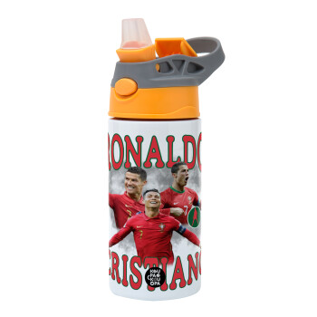 Κριστιάνο Ρονάλντο, Παιδικό παγούρι θερμό, ανοξείδωτο, με καλαμάκι ασφαλείας, Πορτοκαλί/Γκρι (360ml) BPA-FREE