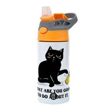 CAT, what are you going to do about it!, Παιδικό παγούρι θερμό, ανοξείδωτο, με καλαμάκι ασφαλείας, Πορτοκαλί/Γκρι (360ml) BPA-FREE