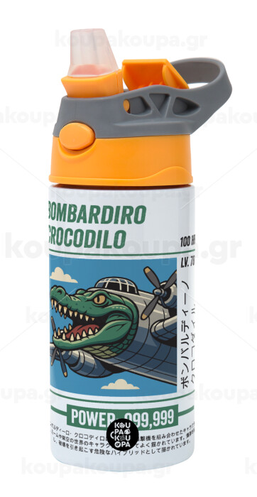 Bombardiro Crocodilo, Παιδικό παγούρι θερμό, ανοξείδωτο, με καλαμάκι ασφαλείας, Πορτοκαλί/Γκρι (360ml) BPA-FREE