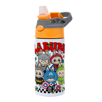 Labubu superheroes, Παιδικό παγούρι θερμό, ανοξείδωτο, με καλαμάκι ασφαλείας, Πορτοκαλί/Γκρι (360ml) BPA-FREE