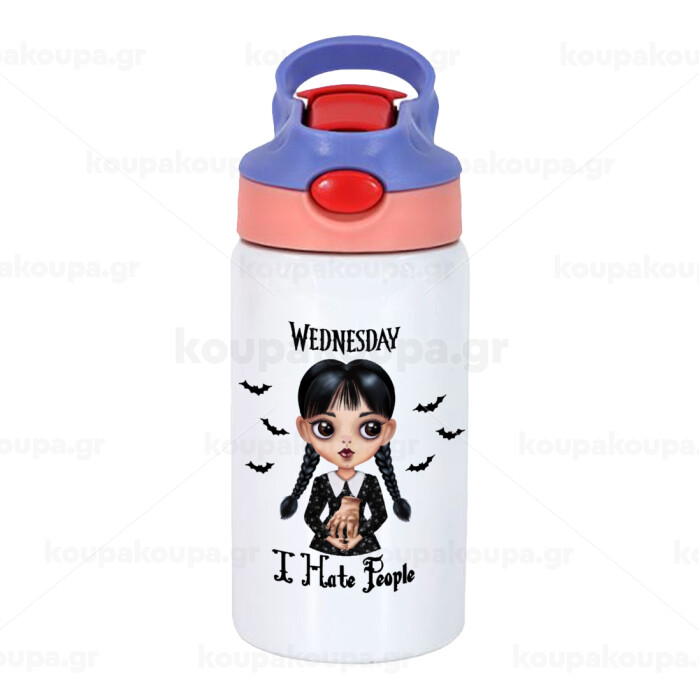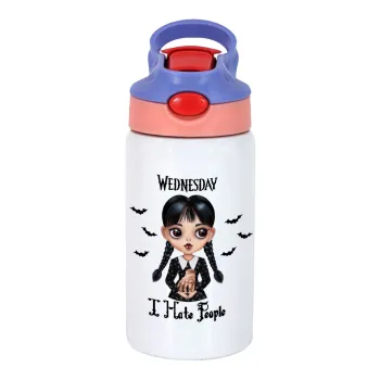 Wednesday Adams, i hate people, Παιδικό παγούρι θερμό, ανοξείδωτο, με καλαμάκι ασφαλείας, ροζ/μωβ (350ml)