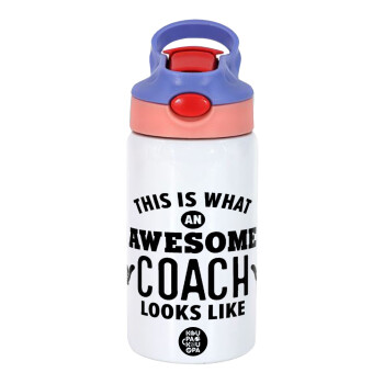 This is what an awesome COACH looks like!, Παιδικό παγούρι θερμό, ανοξείδωτο, με καλαμάκι ασφαλείας, ροζ/μωβ (350ml)