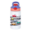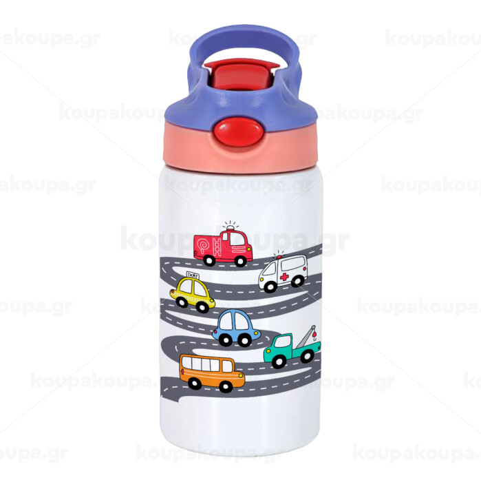 Hand drawn childish set with cars, Παιδικό παγούρι θερμό, ανοξείδωτο, με καλαμάκι ασφαλείας, ροζ/μωβ (350ml)