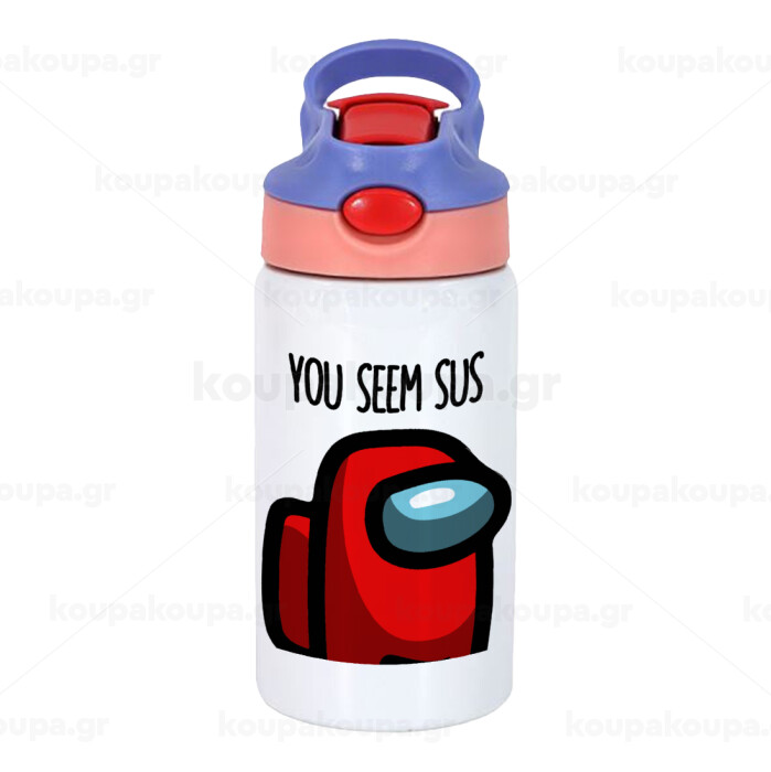 Among US, you seem sus, Παιδικό παγούρι θερμό, ανοξείδωτο, με καλαμάκι ασφαλείας, ροζ/μωβ (350ml)