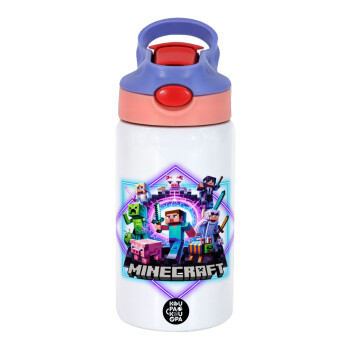 Minecraft Nether Portal, Παιδικό παγούρι θερμό, ανοξείδωτο, με καλαμάκι ασφαλείας, ροζ/μωβ (350ml)