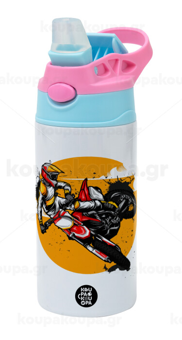 Motocross, Παιδικό παγούρι θερμό, ανοξείδωτο, με καλαμάκι ασφαλείας, Ροζ/Σιελ (360ml) BPA FREE