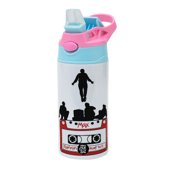 Running up that hill, Stranger Things, Παιδικό παγούρι θερμό, ανοξείδωτο, με καλαμάκι ασφαλείας, Ροζ/Σιελ (360ml) BPA FREE