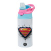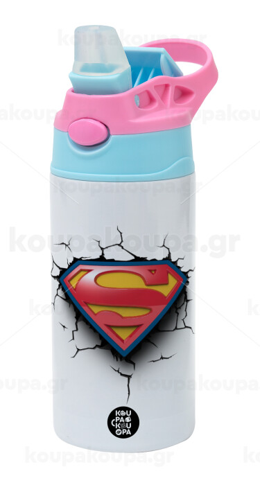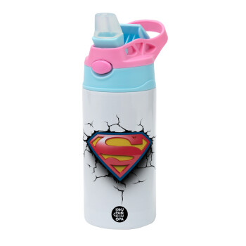 Superman cracked, Παιδικό παγούρι θερμό, ανοξείδωτο, με καλαμάκι ασφαλείας, Ροζ/Σιελ (360ml) BPA FREE