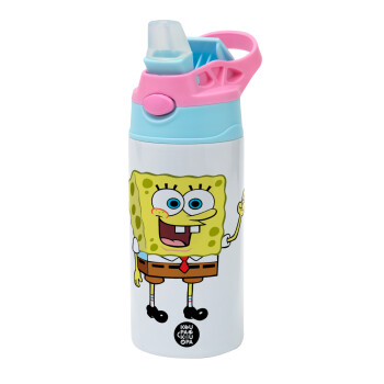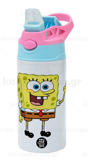 Μπομπ Σφουγγαράκης character, Παιδικό παγούρι θερμό, ανοξείδωτο, με καλαμάκι ασφαλείας, Ροζ/Σιελ (360ml) BPA FREE