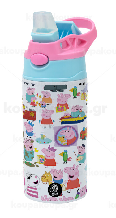 Peppa pig Characters, Παιδικό παγούρι θερμό, ανοξείδωτο, με καλαμάκι ασφαλείας, Ροζ/Σιελ (360ml) BPA FREE