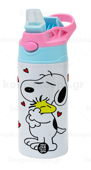 Snoopy Love, Παιδικό παγούρι θερμό, ανοξείδωτο, με καλαμάκι ασφαλείας, Ροζ/Σιελ (360ml) BPA FREE