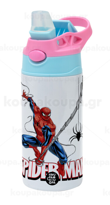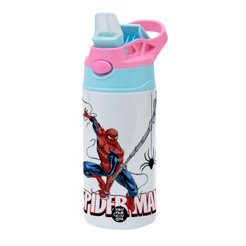 Spiderman fly, Παιδικό παγούρι θερμό, ανοξείδωτο, με καλαμάκι ασφαλείας, Ροζ/Σιελ (360ml) BPA FREE