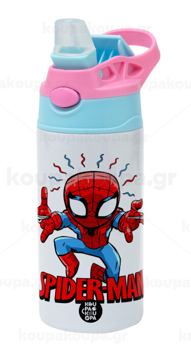 Spiderman flying, Παιδικό παγούρι θερμό, ανοξείδωτο, με καλαμάκι ασφαλείας, Ροζ/Σιελ (360ml) BPA FREE