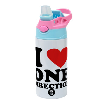 I Love, One Direction, Παιδικό παγούρι θερμό, ανοξείδωτο, με καλαμάκι ασφαλείας, Ροζ/Σιελ (360ml) BPA FREE