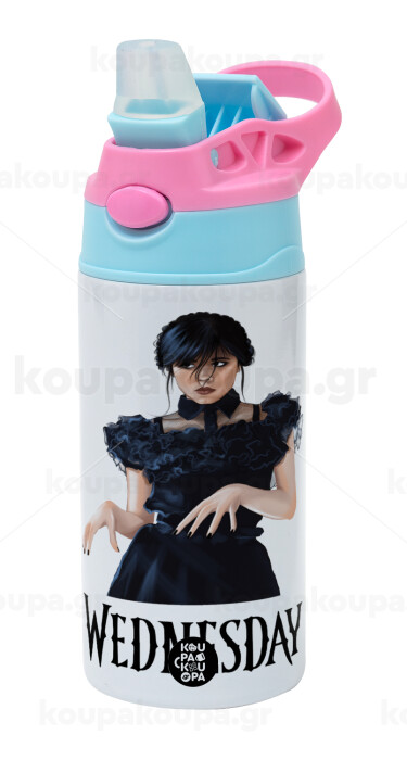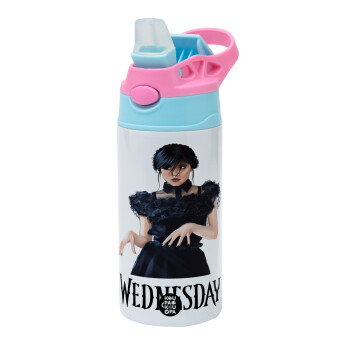 Wednesday Adams, dance with hands, Παιδικό παγούρι θερμό, ανοξείδωτο, με καλαμάκι ασφαλείας, Ροζ/Σιελ (360ml) BPA FREE