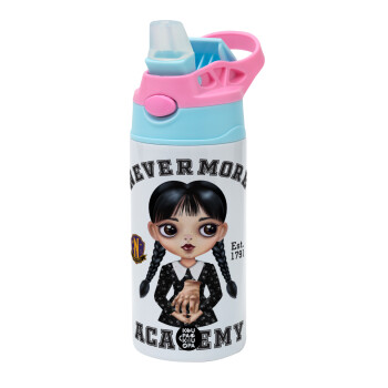 Wednesday Adams, nevermore, Παιδικό παγούρι θερμό, ανοξείδωτο, με καλαμάκι ασφαλείας, Ροζ/Σιελ (360ml) BPA FREE
