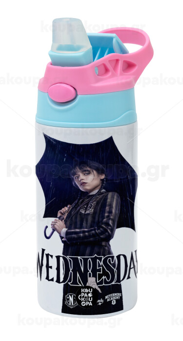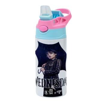 Wednesday rain, Παιδικό παγούρι θερμό, ανοξείδωτο, με καλαμάκι ασφαλείας, Ροζ/Σιελ (360ml) BPA FREE