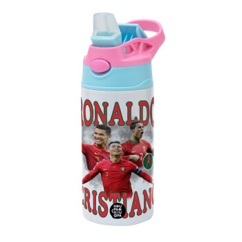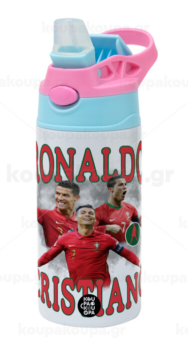 Κριστιάνο Ρονάλντο, Παιδικό παγούρι θερμό, ανοξείδωτο, με καλαμάκι ασφαλείας, Ροζ/Σιελ (360ml) BPA FREE