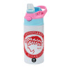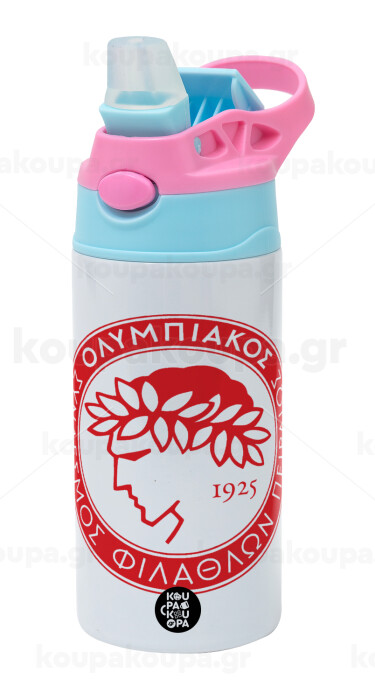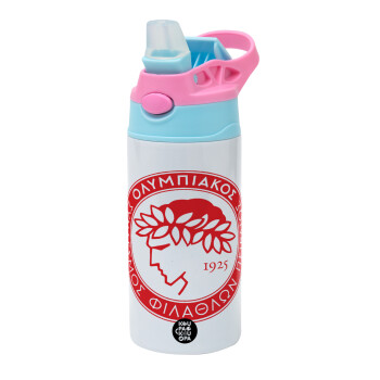Ολυμπιακός, Παιδικό παγούρι θερμό, ανοξείδωτο, με καλαμάκι ασφαλείας, Ροζ/Σιελ (360ml) BPA FREE