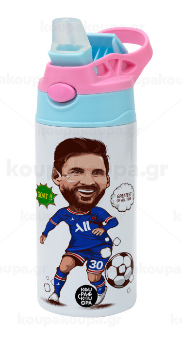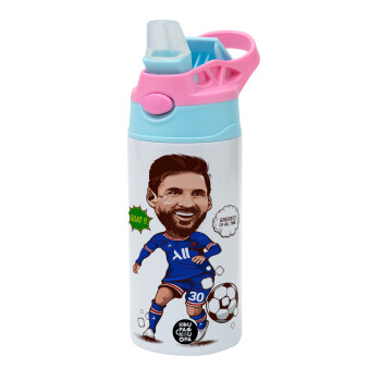 Lionel Messi drawing, Παιδικό παγούρι θερμό, ανοξείδωτο, με καλαμάκι ασφαλείας, Ροζ/Σιελ (360ml) BPA FREE