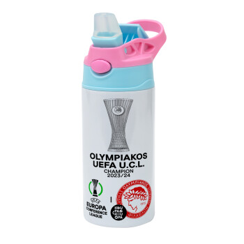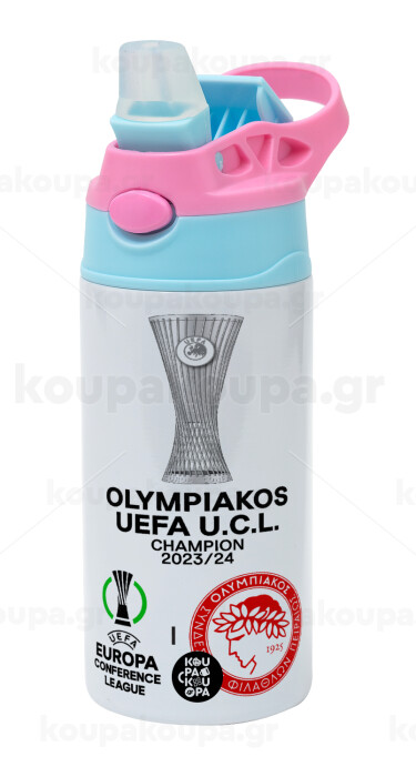 Ολυμπιακός νικητής UEFA Europa Conference League Champion 2023/24, Παιδικό παγούρι θερμό, ανοξείδωτο, με καλαμάκι ασφαλείας, Ροζ/Σιελ (360ml) BPA FREE