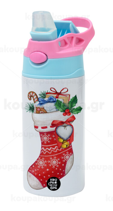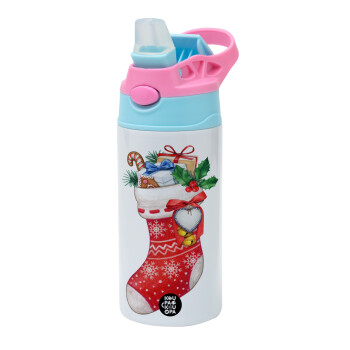 Xmas boot, Παιδικό παγούρι θερμό, ανοξείδωτο, με καλαμάκι ασφαλείας, Ροζ/Σιελ (360ml) BPA FREE