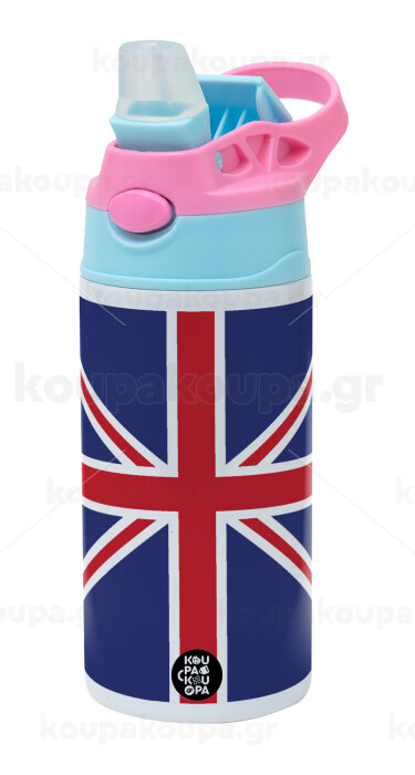 Σημαία Αγγλίας UK, Παιδικό παγούρι θερμό, ανοξείδωτο, με καλαμάκι ασφαλείας, Ροζ/Σιελ (360ml) BPA FREE