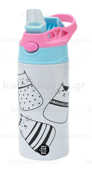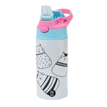 Cute cats, Παιδικό παγούρι θερμό, ανοξείδωτο, με καλαμάκι ασφαλείας, Ροζ/Σιελ (360ml) BPA FREE