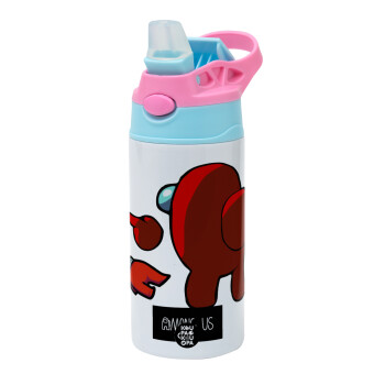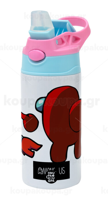 Among US i am impostor..., Παιδικό παγούρι θερμό, ανοξείδωτο, με καλαμάκι ασφαλείας, Ροζ/Σιελ (360ml) BPA FREE