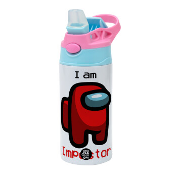 Among US i am impostor, Παιδικό παγούρι θερμό, ανοξείδωτο, με καλαμάκι ασφαλείας, Ροζ/Σιελ (360ml) BPA FREE