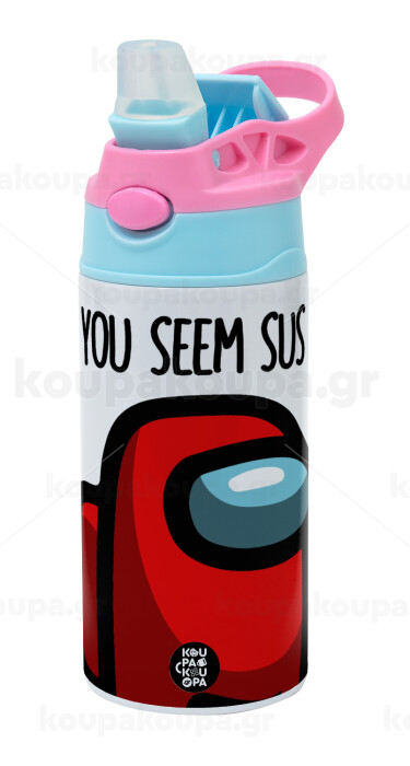 Among US, you seem sus, Παιδικό παγούρι θερμό, ανοξείδωτο, με καλαμάκι ασφαλείας, Ροζ/Σιελ (360ml) BPA FREE