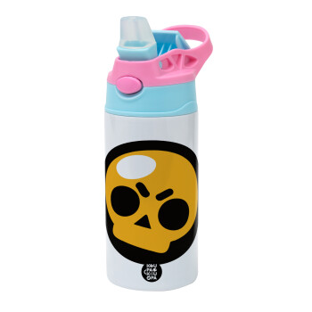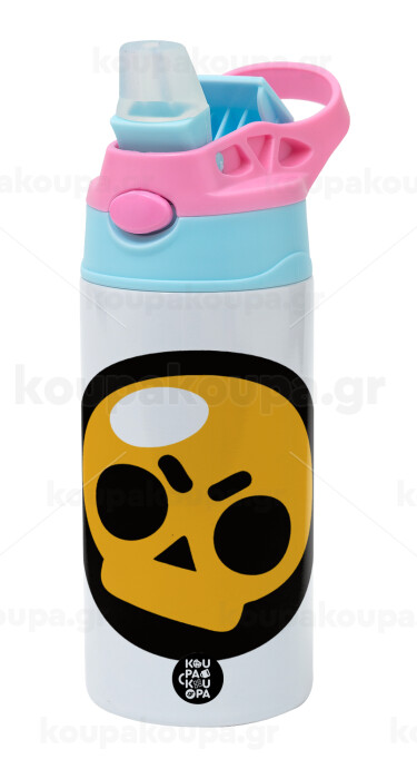 Brawl Stars Skull, Παιδικό παγούρι θερμό, ανοξείδωτο, με καλαμάκι ασφαλείας, Ροζ/Σιελ (360ml) BPA FREE